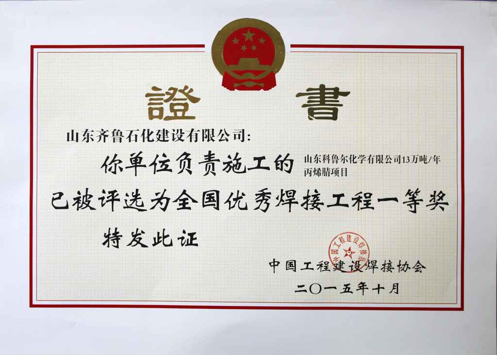 全國優(yōu)質(zhì)焊接工程-山東科魯爾化學(xué)有限公司13萬噸/年丙烯腈項目