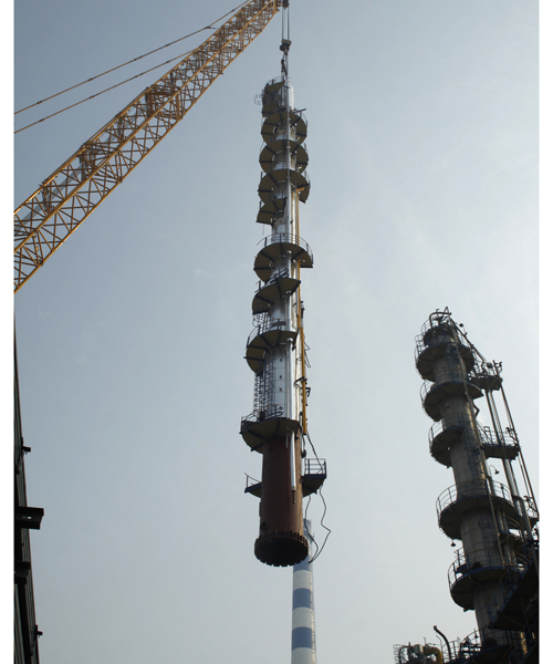 四年一次的齊魯石化大修改造中,煉油廠連續(xù)重整C-505塔更換是重點項目之一,為此,從公司、項目部到車間都高度重視,針對檢修時間緊實際,集中精干力量統(tǒng)籌優(yōu)化,采取模塊化施工,在吊裝前完成了附塔結(jié)構(gòu)、管線、勞動保護和保溫的安裝,在盡量減少立塔后高空安裝工作量、降低安全風(fēng)險的同時,大幅縮短了一半工期。該塔重73噸,高52米,直徑1. 4米,塔壁只有17毫米,體型“瘦高苗條”,吊裝過程中變形風(fēng)險大;吊裝需跨越操作室及空冷框架,就位安裝位置在設(shè)備、管線密集的設(shè)備區(qū)內(nèi),起吊高度近78米,吊裝半徑達(dá)50米,在吊裝作業(yè)中屬于難度少有的。因此,吊裝方案采用650噸履帶吊為主吊、260噸和120噸汽車吊配合,避開施工高峰期,利用中午休息時間完成。最終,在現(xiàn)場領(lǐng)導(dǎo)、技術(shù)人員和施工人員精心組織、密切配合下,圓滿完成了吊裝任務(wù)。