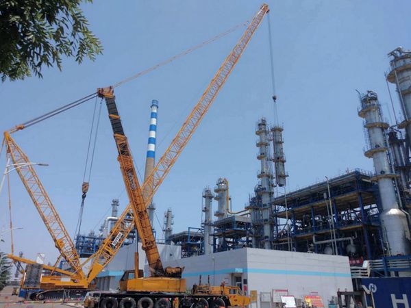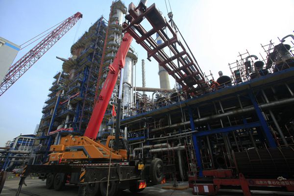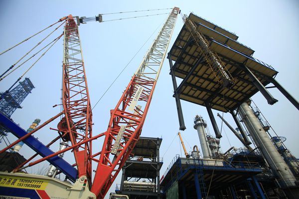 四年一次的齊魯石化大檢修正激戰(zhàn)猶酣。齊魯建設(shè)作為主力軍承擔了煉油廠、烯烴廠等8個生產(chǎn)廠34套生產(chǎn)裝置、5200多項檢修改造任務(wù),承擔的吊裝施工作業(yè)占大修改造總吊裝任務(wù)的85%以上。多區(qū)域多裝置同步作業(yè),共投入了650噸、500噸、260噸、160噸等各類大型吊車70余臺,為歷次大檢修之最。